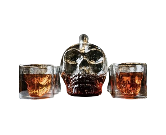 Karafa lebka 1 l – sada se 6 skleničkami 3D lebka 75 ml je stylová souprava, která obsahuje 1L karafu ve tvaru lebky a 6 sklenic o objemu 75 ml. Ideální pro servírování alkoholu a jako originální dárek pro muže. Tento set je pro ty, kteří milují tajemství a výjimečné zážitky a jsou prostě stylový. Tato jedinečná karafa z ručně foukaného skla má kapacitu 1000 ml , což zaručuje dostatek prostoru pro vaše oblíbené nápoje.