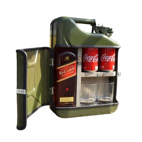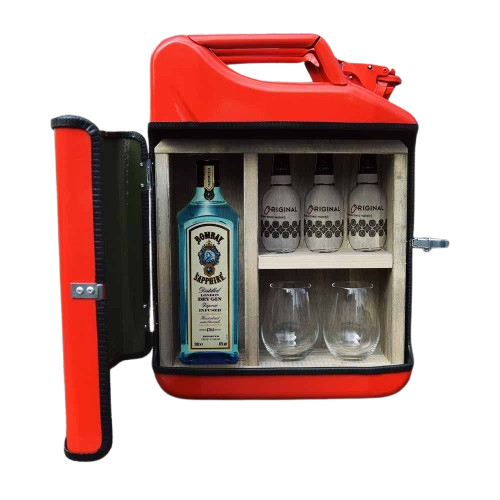 Přenosný gin bar můžete perfektně použít jak venku tak uvnitř. Vezměte ho na piknik v parku, na pláž či při grilování s přáteli, nebo na dovolenou. Dodává se se 2 skleničkami na váš džin a má prostor na láhev alkoholu a několik plechovek. Jedná se o autentický kanystr na palivo přeměněný na vintage vypadající Gin Bar. Má tři robustní rukojeti, takže jej můžete snadno zvednout.